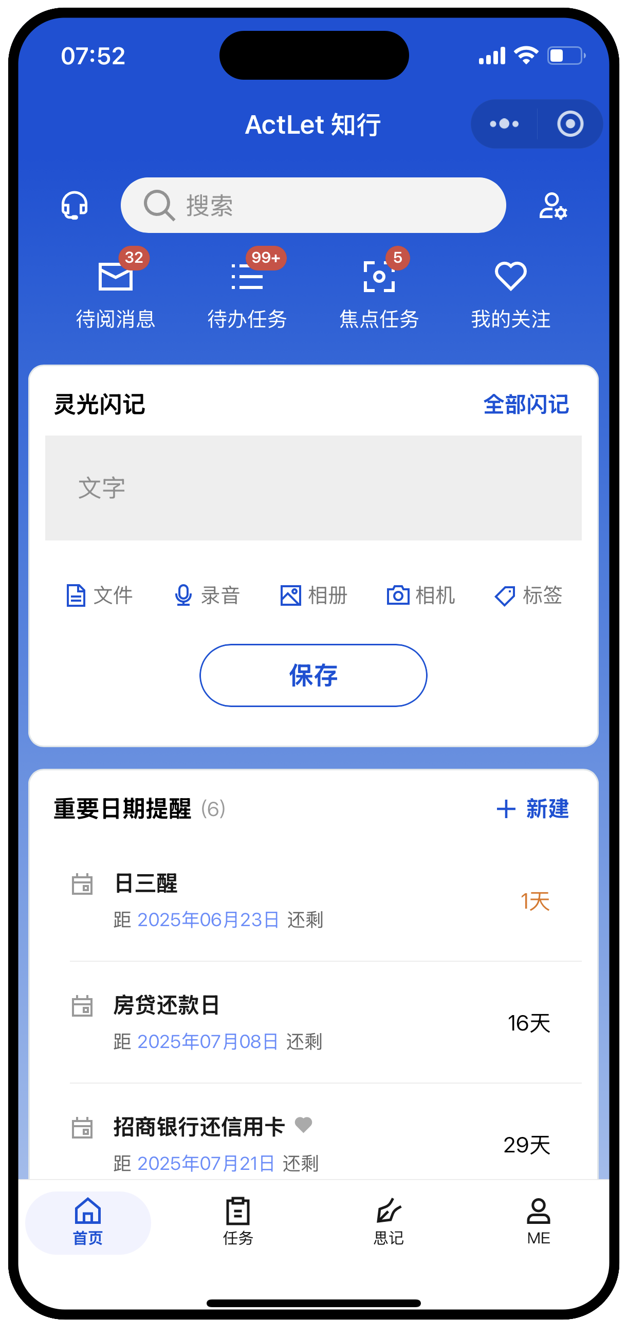 ActLet 支持任务管理、知识库、闪记日记、日期提醒、个人主页等。