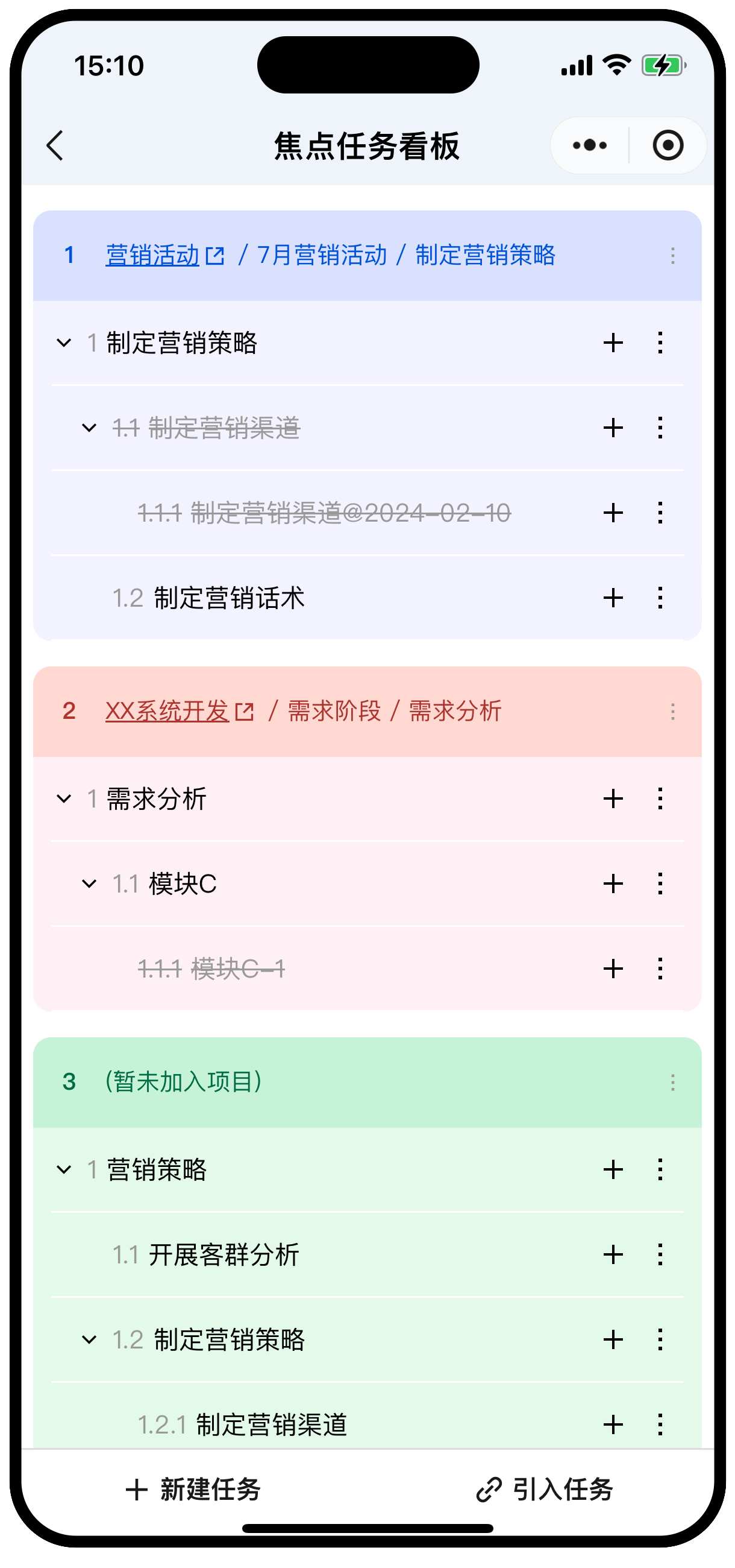 - 支持项目、列表、焦点多种任务视图。可分解任务、倒排计划。
